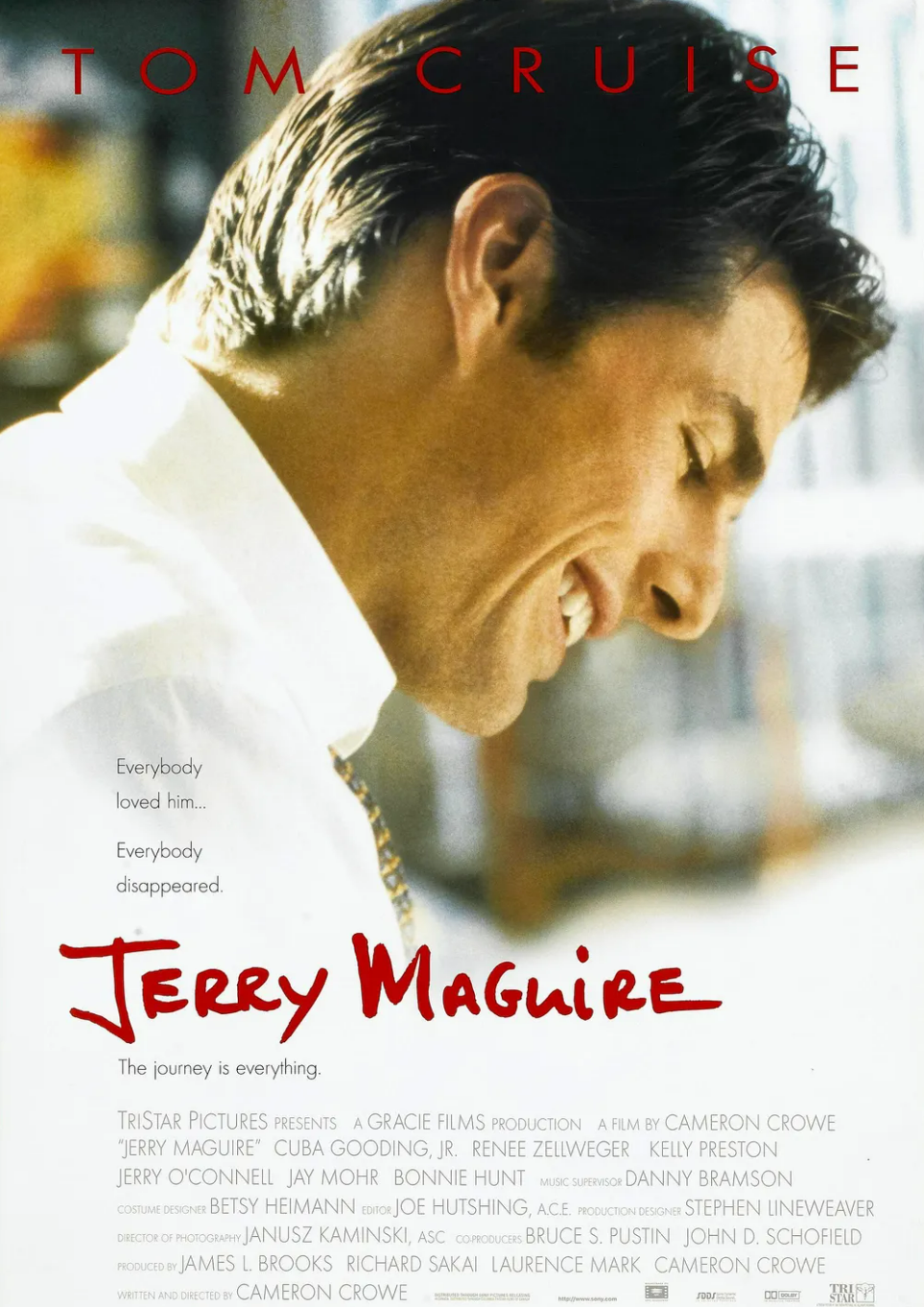 말이 필요 없는 할리우드 하면 떠올리는 세계적인 스타 톰 크루즈(Tom Cruise)는 1962년 7월 3일 뉴욕 시라큐스에서 토마스 크루즈 마포더 4세로 태어났습니다. 그는 배우로 활동하면서 1980년대 할리우드를 대표하는 인물 중 한 명으로 떠올랐고, 그 이후로도 할리우드 영화의 아이콘으로서 그의 지위를 유지하고 있습니다. 그의 수많은 대표 영화들이 있지만 토니 스콧(Tony Scott) 감독의 탑건(Top Gun)(1986)을 빼고 이야기하는 것은 어렵습니다. 물론 톰은 이 영화 이전 많은 영화를 통해 인지도를 쌓고 할리우드의 떠오르는 신성이었지만, 비로소 이 영화를 통해 그는 일약 세계적인 스타로 떠오르게 됩니다. 이 영화는 개봉 이후 시대를 상징하는 영화가 되었으며 이 영화 이후 그는 현재까지 미국을 대표하는 영화배우로서의 입지를 계속해서 유지하고 있습니다. 그가 출연한 영화 제목만 봐도 그가 얼마나 할리우드 대표배우로서의 경력을 이어나가고 있는지 이해할 수 있습니다. 영화 탑 건의 성공 이후 그는 '컬러 오브 머니(The Color of Money)'(1986), '칵테일(Cocktail)'(1988), '7월 4일생(Born on the Fourth of July)'(1989), '폭풍의 질주(Days of Thunder)'(1990), '어 퓨 굿 맨(A Few Good Men)'(1992), '뱀파이어와의 인터뷰(Interview With The Vampire: The Vampire Chronicles)'(1994)등 엄청난 흥행작품에 출연하며 최고의 경력을 이어 나갑니다. 그는 이 시기 영화배우로서뿐만 아니라 영화 제작에도 뛰어들어서 또다시 성공을 하게 됩니다. TV시리즈가 원작인 '미션 임파서블(Mission: Impossible)'(1996)을 영화로 만들면서 지금까지 성공적인 시리즈로 자리매김할 수 있는 시작을 보여주었습니다. 이 영화 이후에도 폴 토머스 앤더슨(Paul Thomas Anderson) 감독의 '매그놀리아(Magnolia)'(1999)에서 보여준 연기로 관객과 평단으로부터 최고의 연기라는 찬사를 받기도 했습니다. 이후 '바닐라 스카이(Vanilla Sky)', (2001)에서는 '제리 맥과이어(Jerry Maguire)'이후 카메론 크로우(Cameron Crowe) 감독과 다시 의기투합하여 정체성과 현실에 대한 주제를 잘 보여주었고, SF 블록버스터 '우주전쟁(War of the Worlds)'(2005)에서는 스티븐 스필버그(Steven Spielberg) 감독과 팀을 이루었습니다. 외계인의 침공에 맞서는 아버지를 실감 나게 보여주기도 했습니다. 의 묘사는 그 영화에 인간성의 부캐를 더했고, 팔로어십과 관련성 있는 관계를 유지하면서 상황의 강도를 전달하는 그의 능력에 대해 찬사를 받았습니다. 이후의 수많은 영화들에서 펼친 그의 연기는 그의 할리우드에서의 영향력과 세계적인 스타로서의 면모를 유감없이 보여주고 있습니다. 르네 젤위거(Rene Zellweger) 또한 이 영화를 통해 일약 할리우드를 대표하는 여배우가 되었으며, 성공적인 배우 인생의 시작을 알렸습니다. 이 배우에 대한 이야기는 앞으로 진행될 다른 영화에서 다루도록 하겠습니다.